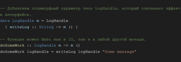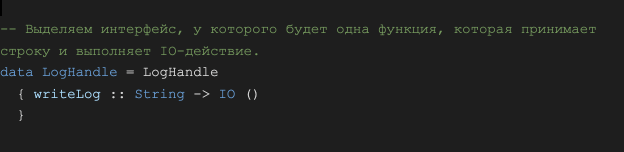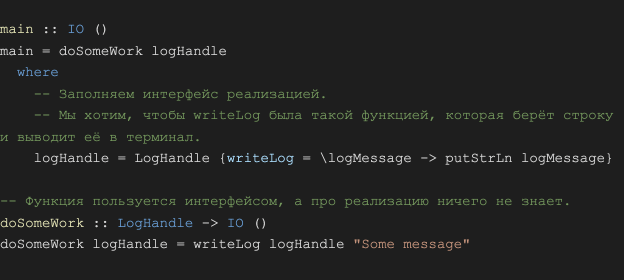 Теперь, если потребуется поменять реализацию логирования, необходимо изменить всего лишь один участок кода, в котором определена реализация через putStrLn. Кроме этого, если потребуется использовать другую реализацию в одной из частей проекта, туда можно передать тот же интерфейс, но заполнить его другой реализацией.