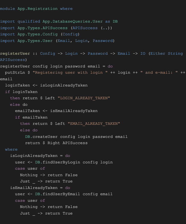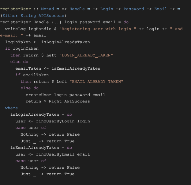 Кстати, паттерн очень удобно использовать с расширением RecordWildCards. Оно позволяет не передавать handle явно как аргумент в каждую функцию интерфейса. С ним функция registerUser будет выглядеть так: