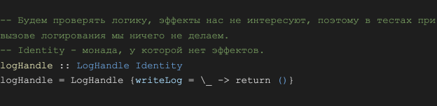Теперь в функцию registerUser можно подставлять другую реализацию, а это значит, её можно локально тестировать. Воспользуемся пакетом hspec. Как вы помните, у типов хэндлов есть параметр, который указывает, в какой монаде мы работаем. Раньше мы заполняли поля хэндла IO-функциями, поэтому при передаче заполненного хэндла в логику функция registerUser параметризировалась монадой IO. Теперь, чтобы написать чистые тесты, необходимо избавиться от IO, но все ещë нужна монада: отличное применение Identity. Раньше мы заполняли поля хэндла функциями, которые обращаются в IO: если функция делала запись в базу данных, то результатом было IO (), если функция доставала значение, то результатом было IO Value. Вместо IO будет Identity. Кроме этого, если базы данных нет, то и записывать нечего, поэтому функции записи данных будут игнорировать свой аргумент и возвращать Identity (). Функции, которые возвращают значения из базы данных, будут редактироваться под каждый тест. Если мы проверяем поведение, когда пользователь с указанным логином уже есть, то функция findUserByLogin будет возвращать Just User, когда логин свободен, функция будет возвращать Nothing. Такие данные, которые создаются специально для тестов, называют стабами (stub).