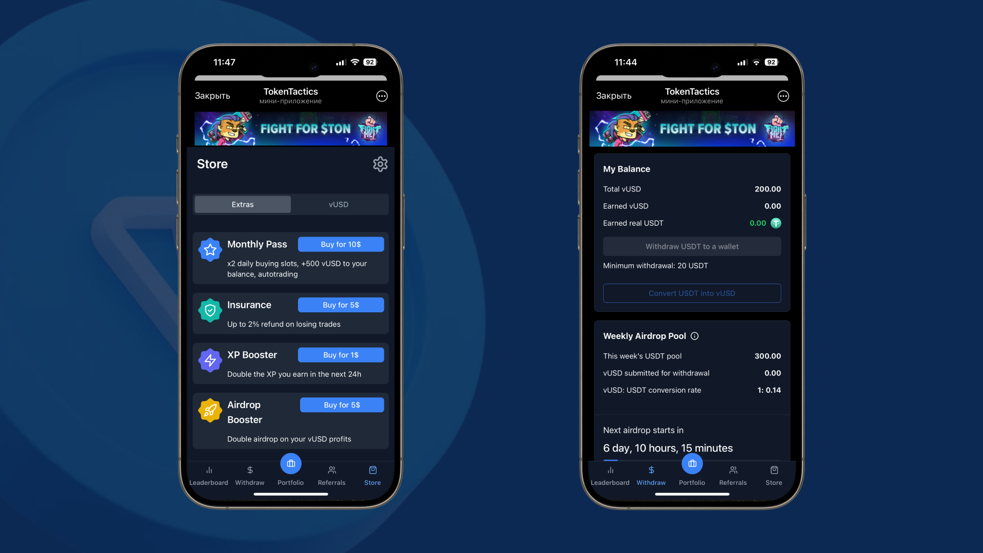 Мы реализовали Telegram Mini App с функционалом торговли активами на демо-счёте и возможностью конвертации в реальные активы в будущем. Интерфейс был адаптирован под Telegram, с учётом ограничений формата TMA. Пользовательский путь включал регистрацию, создание виртуального крипто-портфеля, участие в рейтингах и получение вознаграждений. Мы спроектировали архитектуру приложения так, чтобы приложение можно было масштабировать и развивать новыми функциями.