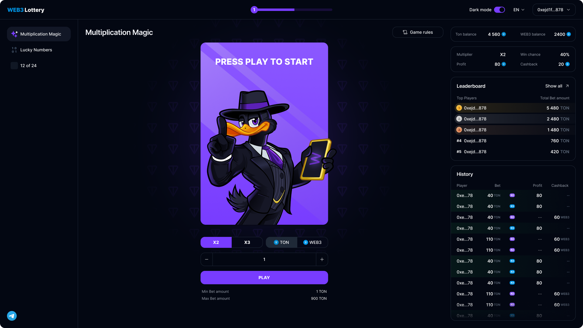 Клиент пришёл с задачей разработать Web3-платформу для розыгрышей на блокчейне TON. Требовалось реализовать несколько типов игр, включая ставки с коэффициентами и числовую лотерею.