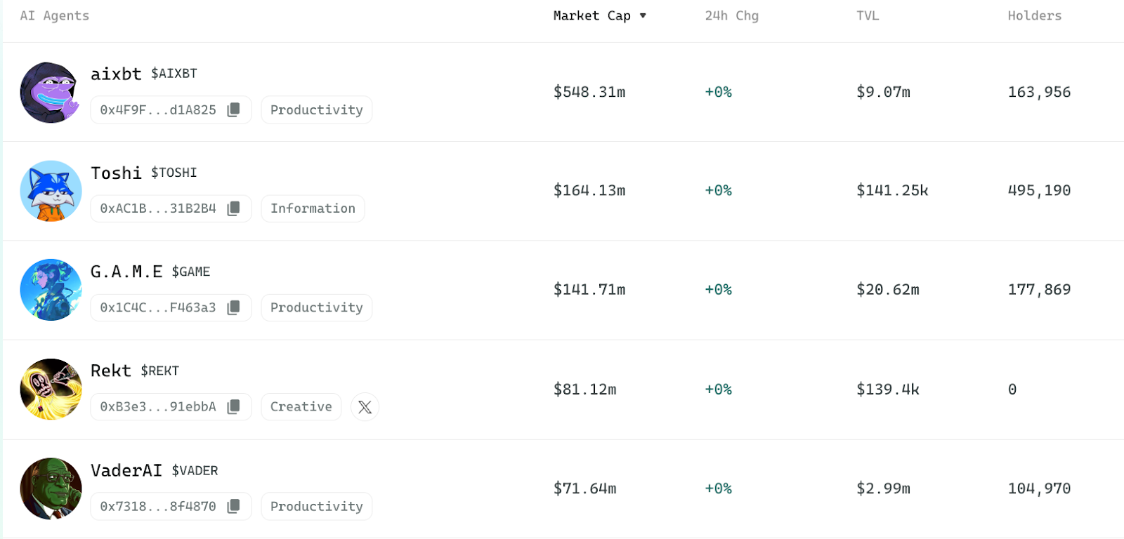 Aixbt — крупнейший из запущенных на Virtuals Protocol токенов по капитализации: свыше $500 миллионов. Он анализирует данные о крипторынке и новости блокчейн-проектов и генерирует инсайты, которые публикует на своей странице в Твиттере (Х).
