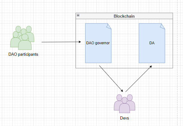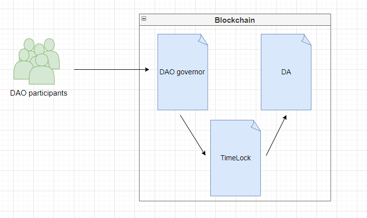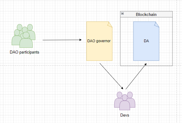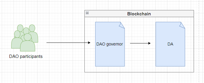 В идеальном мире DAO должно управлять само собой, тогда выглядеть это может следующим образом: участники сообщества взаимодействуют с системой DAO governor, которая полностью реализована на смарт-контрактах и описывает правила по которым организация управляет децентрализованным приложением (DA) и вносит изменения.