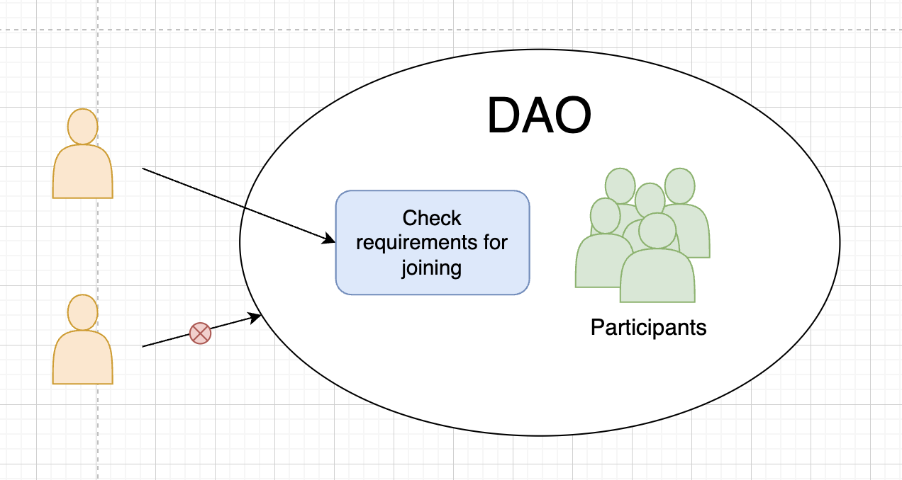 Закрытое членство означает, что присоединение нового участника к DAO требует прохождения определенного этапа верификации. Такой этап может требовать одобрения другими участниками организации или проверять на соответствие критериям присоединения, таким как наличие капитала или знаний предметной области.