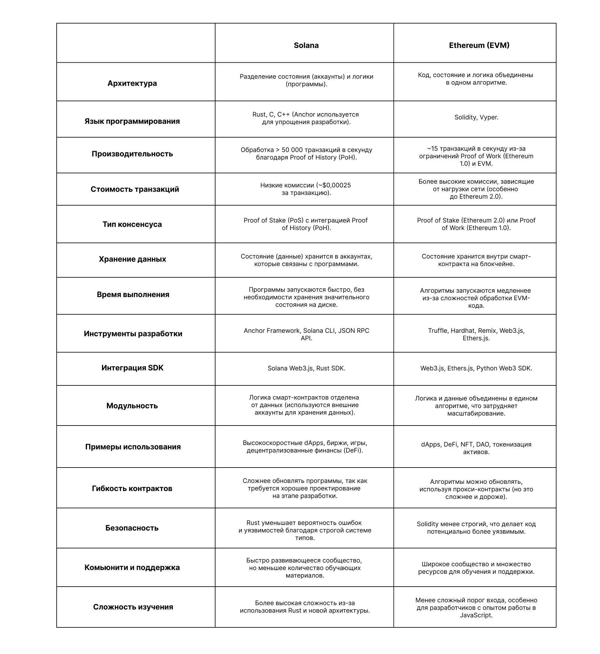Архитектура смарт-контрактов Solana существенно отличается от традиционных блокчейнов, поддерживающих Ethereum Virtual Machine (EVM). В классических системах программный код, аргументы вместе с состоянием сосредоточены в одном контракте. В Solana же хранение данных и вычислительная логика разграничены.
