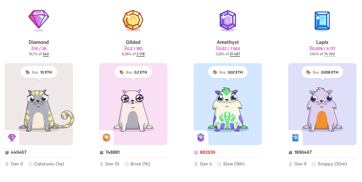 У каждого криптокотика из игры CryptoKitties — уникальный внешний вид и набор характеристик. Источник: cryptokitties.co