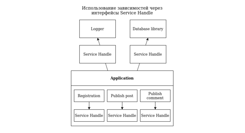 Приложение разрабатывается с использованием интерфейса вместо прямого вызова функций внутри библиотек. Связь с библиотеками указывается один раз при заполнении нового интерфейса Service/Handle, а дальше этот интерфейс передаётся в другие функции. Таким образом мы легко и обособленно можем вносить любые изменения, связанные с зависимостями, меняя код только в одном месте. Из схемы выше видно, что интерфейс можно добавить к каждой части проекта, причём у каждой такой части он будет свой.