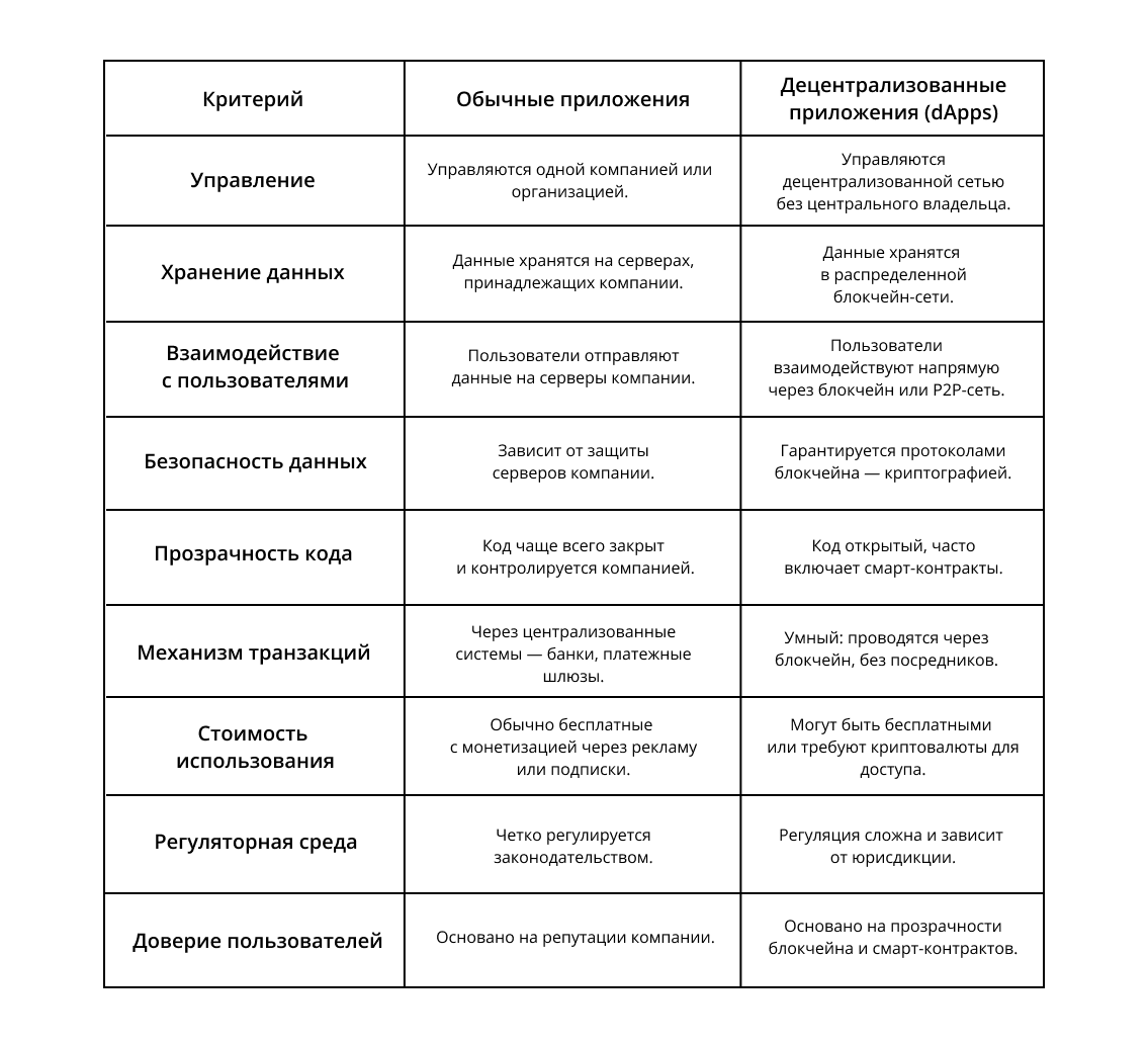 Социальные сети, финансовые сервисы и игры работают на основе серверов одной компании. То есть третья сторона контролирует данные пользователей, принимает решения о работе платформы и нередко монетизирует личную информацию. dApps же строятся на совершенно иной архитектуре.
