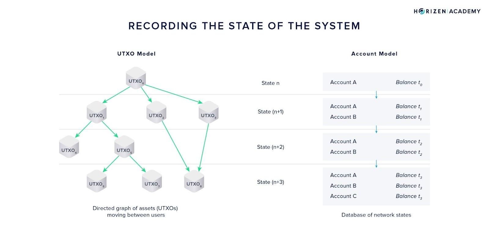 Cardano учла опыт не только Ethereum, но и Bitcoin. Для управления балансом и обмена транзакциями и сообщениями Ethereum использует Account-based модель. У каждой учётной Ethereum-записи есть определённое состояние и Ethereum-адрес; чтобы управлять учётной записью, нужно создать Ethereum-кошелёк. В Account-based модели балансы хранятся в виде глобального состояния учётных записей, где состояние счёта сопоставляется адресу учётной записи. Глобальное состояние обновляется с каждым блоком. Это похоже на базу данных, которая в Ethereum носит название префиксного дерева Меркла.