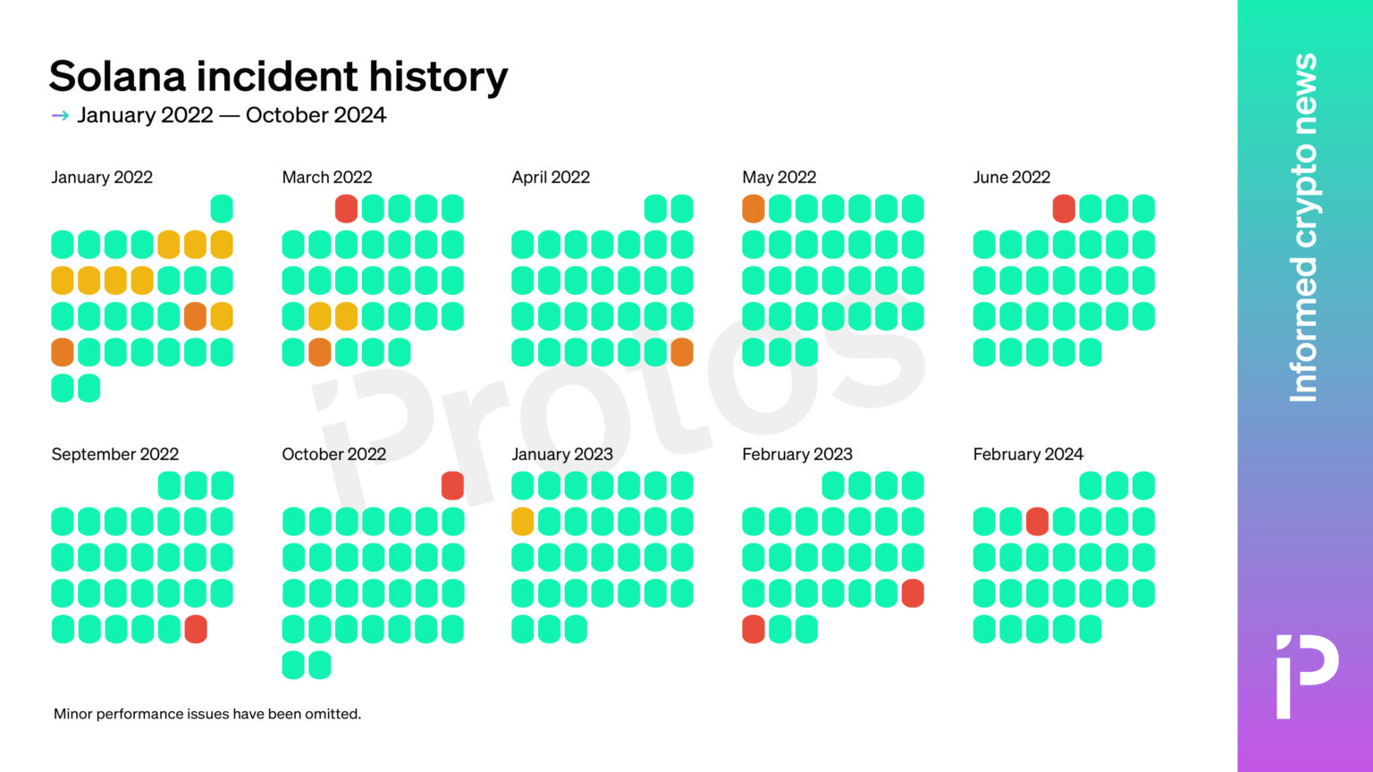 В апреле крипто-СМИ широко освещали новость о том, что якобы 75% транзакций на Solana завершались неудачей. Дело было в ходе первой волны популярности мемкойнов. На самом деле подавляющее большинство неудачных транзакций были размещены арбитражными ботами, то есть представляли собой спам. Другое дело, что сетевой модуль Solana (QUIC Network) недостаточно оптимизирован для регулирования спама; проблема должна отчасти решиться с запуском клиента Firedancer.