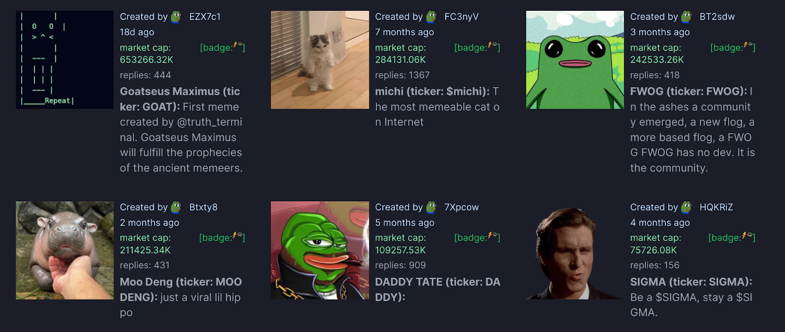 Среди популярных мемов, запущенных на Pump.fun, — $MOTHER, $MOODENG, $GOAT и др. Большая часть торговли осуществляется через Телеграм-ботов, прежде всего Trojan.