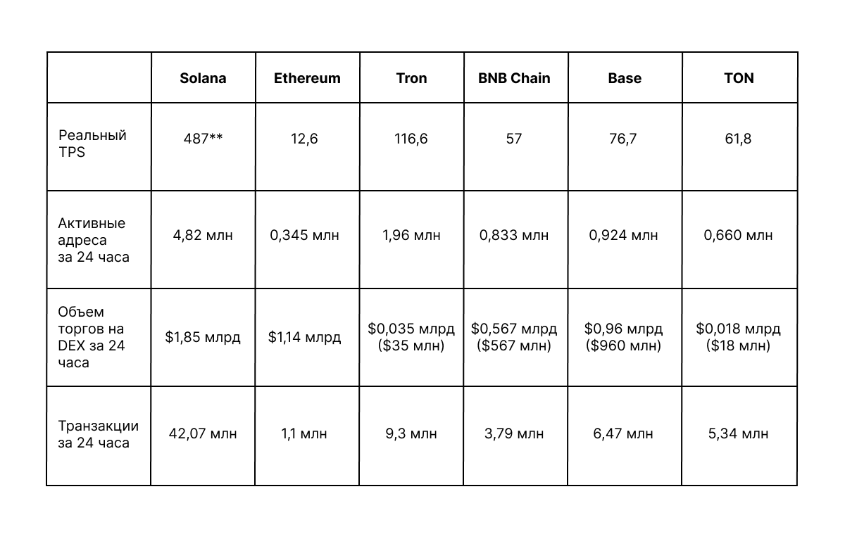 Как мы уже упомянули, время финализации транзакции на Solana составляет около 5-6 секунд – примерно столько же, сколько на TON. Что до комиссии, то она в конце октября 2024 все еще составляет около $0,035 из-за хайпа вокруг мемкойнов, но в обычные периоды она может быть ниже $0,01, что ниже комиссии на TON ($0.025) – хотя и выше, чем на Base, Blast и других L2 (в среднем $0,003).