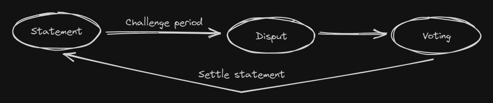 - Statement. Утверждение добавляется в оракул вместе с наградой. Предполагается что награду сможет забрать тот, кто сможет оспорить утверждение.