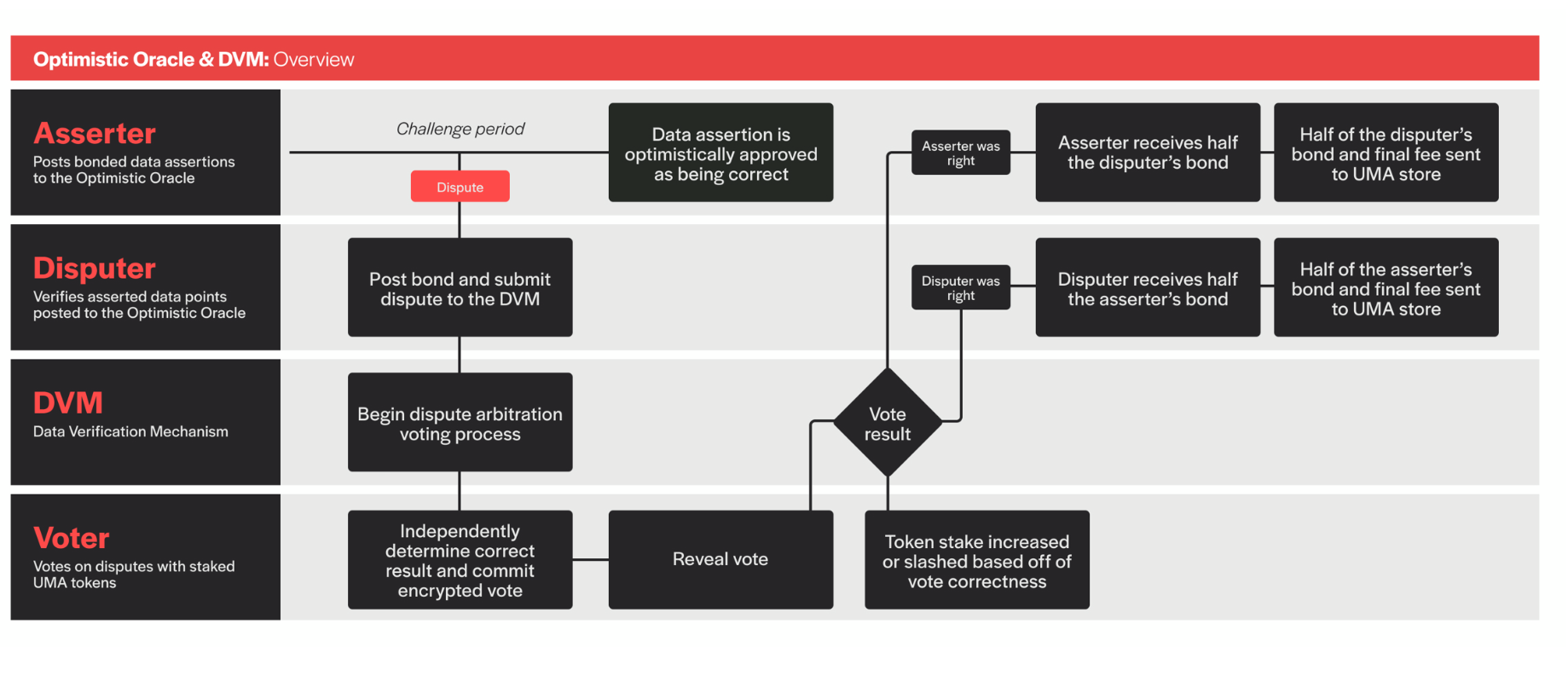UMA оракул позволяет смарт-контрактам быстро запрашивать и получать информацию. Однако до того момента пока информация станет подтвержденной, пройдет определенный момент времени и отработает целый процесс верификации данных.
