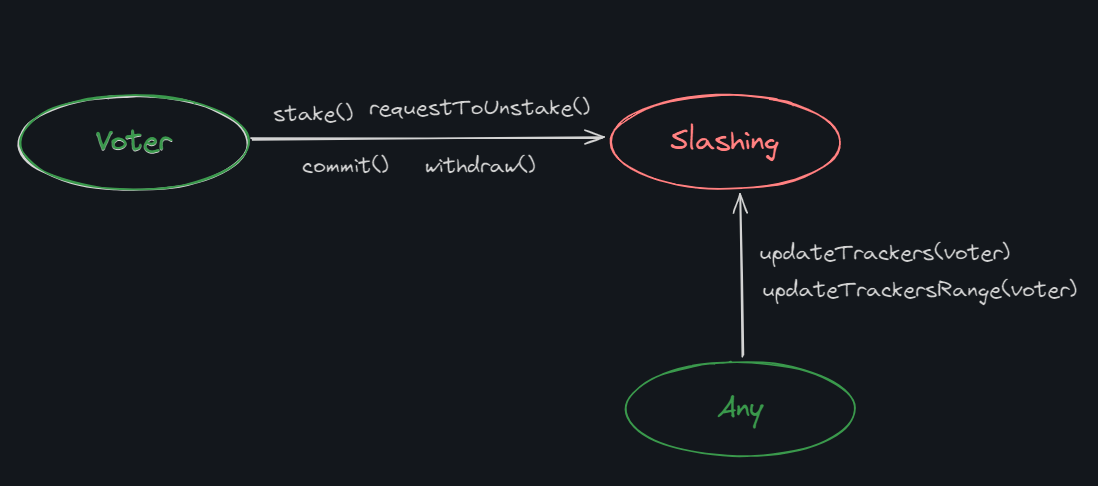 Voter принимает участие в голосовании на двух этапах: передача голоса в закрытую и раскрытие своего голоса. Так называемая схема «commit/reveal». Где на первой стадии смарт-контракту передается результат хеширования голоса, а потом его раскрытие. Это необходимо для того, чтобы никто не видел результатов голосования участников. Считается, что если участники не знают результата голосования других, то это гарантирует действительно независимое голосование.